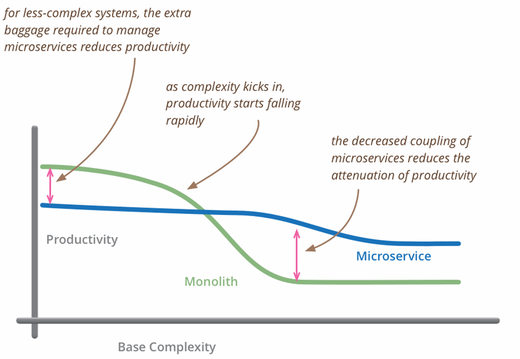 Zoals het bovenstaande plaatje laat zien is een Microservice Architectuur niet altijd rendabel. Wanneer schaalbaarheid en flexibiliteit geen eisen zijn, is een monolithische opzet soms de beste oplossing. Bij een applicatie die wordt doorontwikkeld is een Microservice Architectuur al snel de beste keuze. Wanneer performance, schaalbaarheid en duurzaamheid eisen zijn, dan kun je eigenlijk niet om een Microservice Architectuur heen. Amazon heeft berekend dat een vertraging van honderd milliseconde op hun webwinkel één procent verkopen kost.