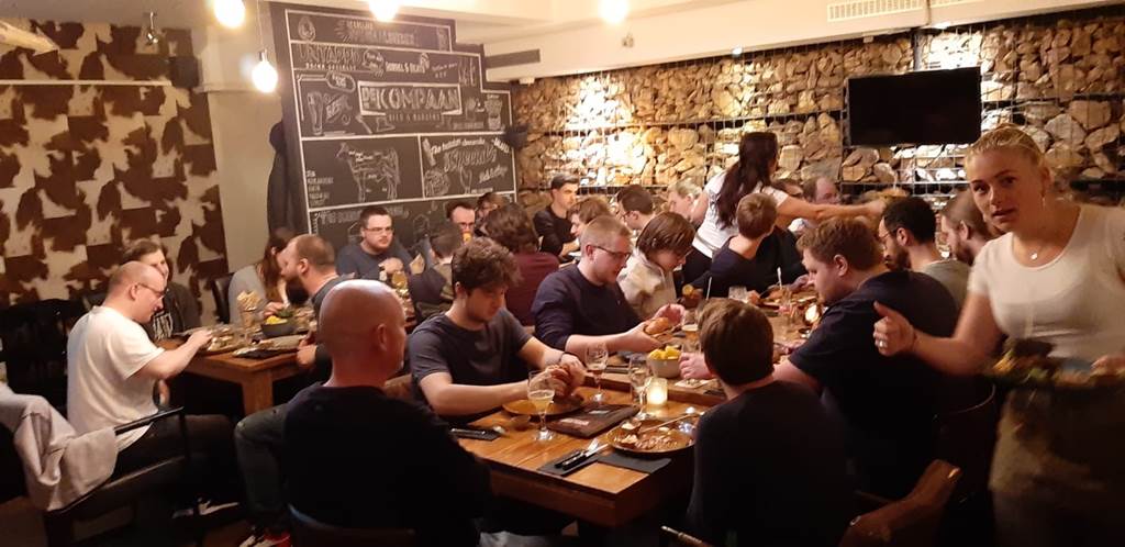 Daar werd hen een pas overhandigd voor de biertapwand. Na het laten zien van hun tapskills, namen ze plaats met het zelfgetapte drankje in de ruimte waar Covadis was gepositioneerd. Om zes uur was het gezelschap compleet en niet veel later werden de burgers en friet geserveerd.