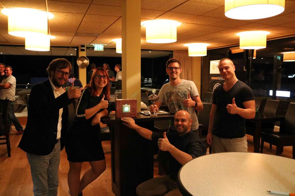 Team ‘Three Guys, a Girl and a Pizza Place’, een kleine woordspeling op de titel van een comedyserie, won de prijs met een intelligent stopcontact dat op basis van marktprijzen real time van kleur verandert. Groen is go en rood is no. Voor captain Niels kwam de winst zichtbaar als een aangename verrassing. Ten Barge is helder in zijn jury-oordeel. “We zijn trots op het enthousiasme en de passie van alle teams. Het winnende team heeft echt het ei van Columbus gevonden.” Ook Tom, captain van de nummer twee, lijkt te kunnen leven met zijn prijs. “De volgende Hackathon win ik weer”, zei hij na afloop. Verwijzend naar de vorige Covadis Hackaton, waar de charismatische software architect wel wist te winnen.