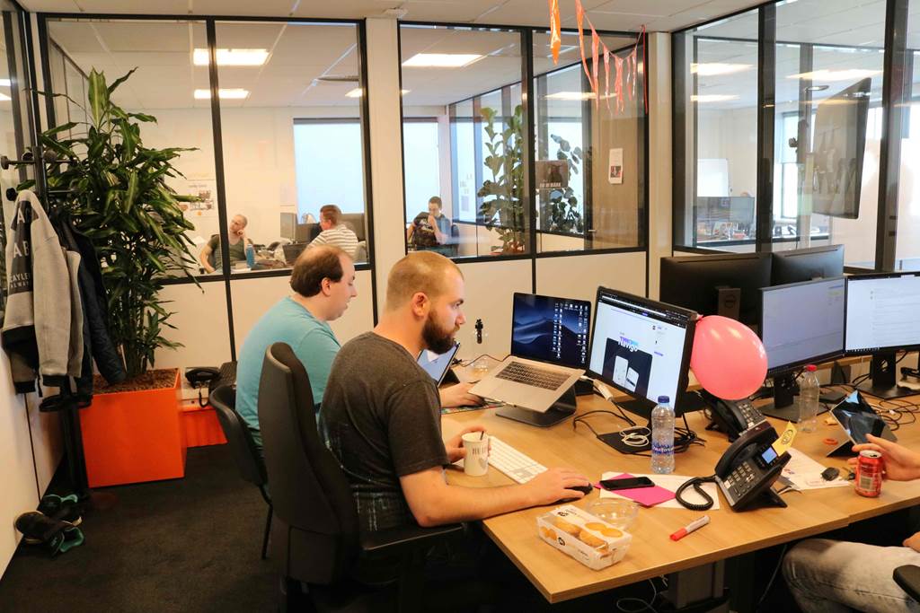De feestelijke prijsuitreiking en de borrel naderhand zijn een gevolg van een dag geploeter, gekonkel en gespeculeer. De collega’s van Covadis en NieuweStroom zijn verdeeld in acht teams. In het diepste geheim troffen de Achterhoekers en de Limburgers voorbereidingen voor de grote dag van de Hackathon. De ochtend bij Covadis begon zoals ieder andere vrijdag. Rond 11.00 uur sloeg de stemming om. Na een openingswoord werd een groepsfoto gemaakt met een drone. Dat ging nog in harmonie, maar daarna barstte de Hackathon los. De teams verschanste zich in hun eigen hoofdkwartieren en lieten er niemand meer in. Alle ontwikkelaars gingen hard aan de slag om briljante toepassingen te bedenken, ontwikkelen en uit te zetten. Uiteraard werd er de nodige (duurzame) energie gestoken in de presentaties, want dat is waar in de eerste instantie de prijzen mee te verdelen zijn.