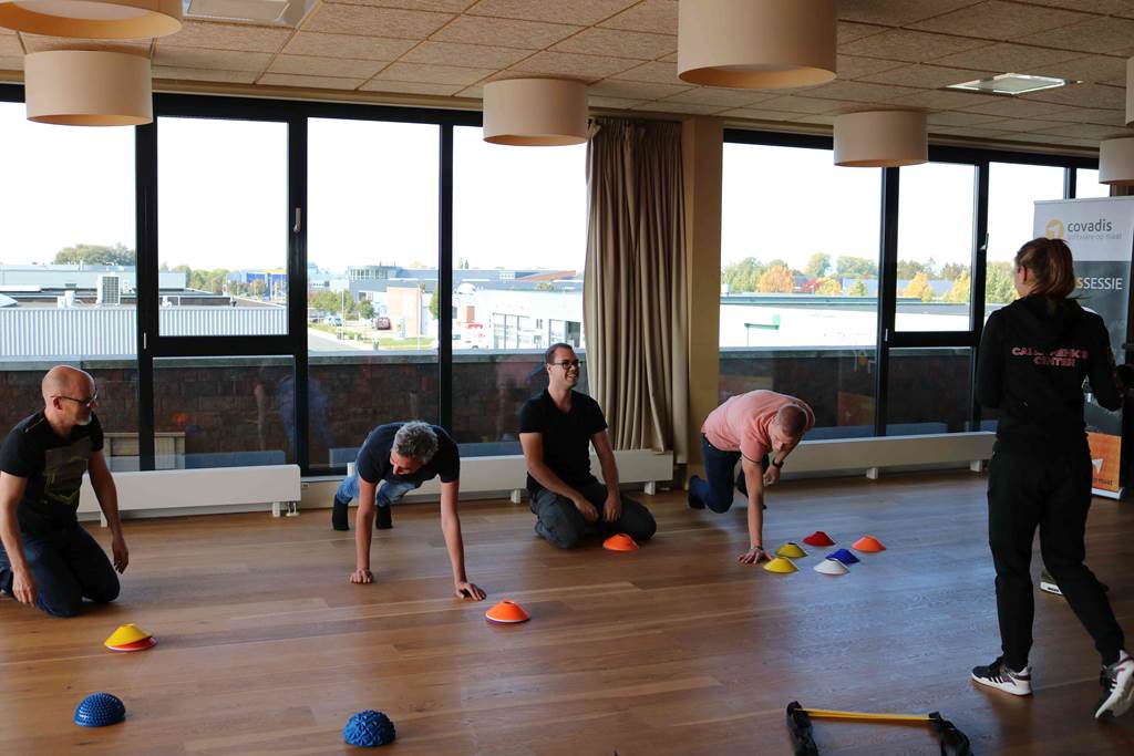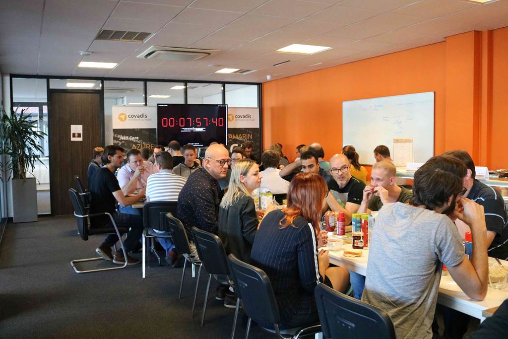 Newton had nooit zijn drie wetten kunnen schrijven op een lege maag. Ook de briljante geesten van de Covadis Hackathon moeten eten. Zij hielden het echter niet bij appeltjes, maar kregen een geheel verzorgde lunch inclusief kroketten en frikandellen. Het vet heeft vast de tandwielen in de hersenen gesmeerd, want als jonge honden galoppeerden de ontwikkelaars weer naar hun bunkers voor de volgende ronde. Ongetwijfeld gemotiveerd door de grote, aftellende klok midden in de lunchroom. Het harde werken werd hierop slechts onderbroken door een lichamelijke oefensessie. Ieder team deed wat fysieke opgaves samen met een personal trainer. Van planken en balansoefeningen tot levend boter-kaas-en-eieren. Al boterde deze combinatie tussen het bekende spelletje en twister niet bij alle teamleden even goed. Covadianen bleken vooral slim te zijn en niet zozeer lenig.