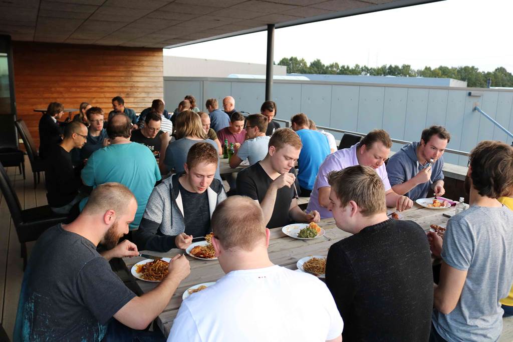 Aan het einde van de middag volgde nog een zeer geslaagd buffet. Het gezelschap kon zowaar eten op het dakterras in de warme oktober-zon. Tussendoor werd voorzichtig het eerste biertje opengemaakt. Na het eten rondde de ploegen hun presentaties af. Al gauw spoedde de teams zich naar de bar voor hun presentatie, het moment waarop sommigen excelleerden met technische hoogstandjes en anderen met humor. Later op de avond zouden de demonstraties twee teams de prijzen opleveren.