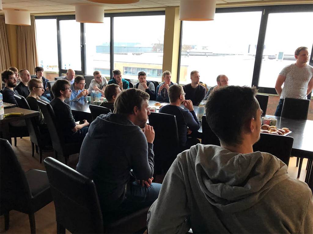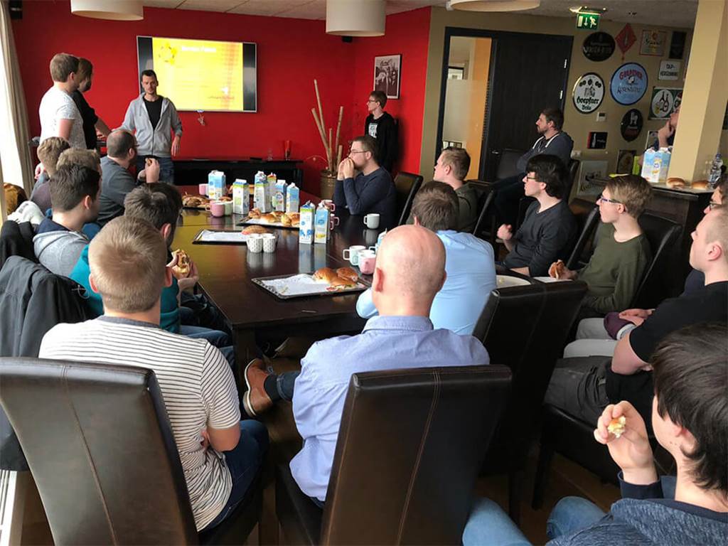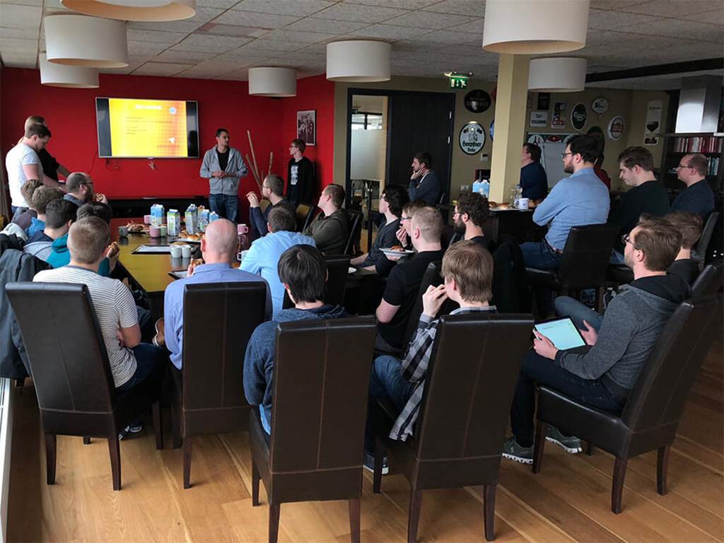 De ontwikkelteams van Covadis hebben zich weer verzameld voor de maandelijkse kennissessie. Dat betekent dat het grote scherm aan gaat en de deur dicht. In opperste concentratie luisteren de collega’s naar vier developers die tekst en uitleg geven over Azure Service Fabric, een systeem en architectuur voor het hosten en managen van Microservices.