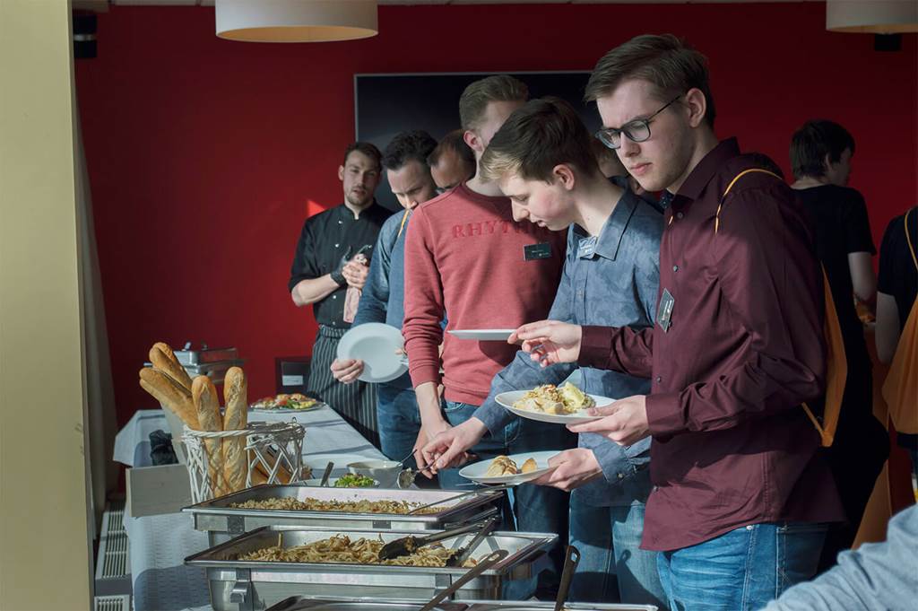 Bij de ingang van Covadis wachten twee medewerkers van het softwarebedrijf alle gasten al op. Na een ferme handdruk reiken zij de bezoeker hun naamplaatje en goodiebag aan waarna de genodigde de trappen mag beklimmen. Het eindstation: de bar. Voor de gelegenheid is de bar ineens een eetzaal inclusief buffet. Want bijna alle gasten zijn vroeger gekomen om een hapje mee te eten.