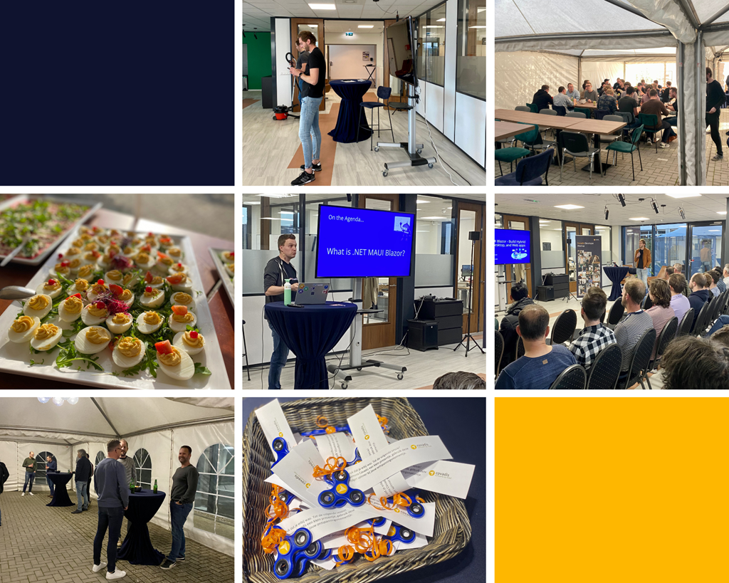 Grote tenten met heaters stonden klaar om alle bezoekers op te vangen. De inloop was van 17:00 tot 18:00, zodat alle bezoekers direct vanuit werk konden aanschuiven voor een heerlijk buffet. Er waren ruim 50 ontwikkelaars geïnteresseerd in het verhaal van Gerald Versluis over .NET MAUI en Blazor.