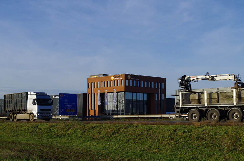 Enthousiast toeterende truckers en automobilisten verwelkomen het nieuwe gezicht aan de A18. Het logo staat groots in het glas en ook op de muren is onze naam en onze kernboodschap goed te zien. Dan hebben we het nog niet eens over de wapperende vlaggen. De meeste van onze collega’s staan niet graag in de spotlights, maar ons logo doet dat zeker wel.