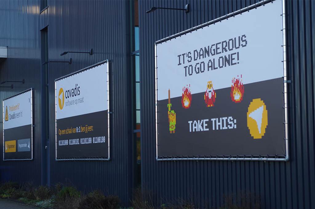 “Het is sowieso tof dat we nu goed zichtbaar zijn aan de A18”, vervolgt hij. “Daarnaast is het leuk om het weer net anders dan andere bedrijven te doen. Op de Covadis manier dus, met de Covadis-saus.”