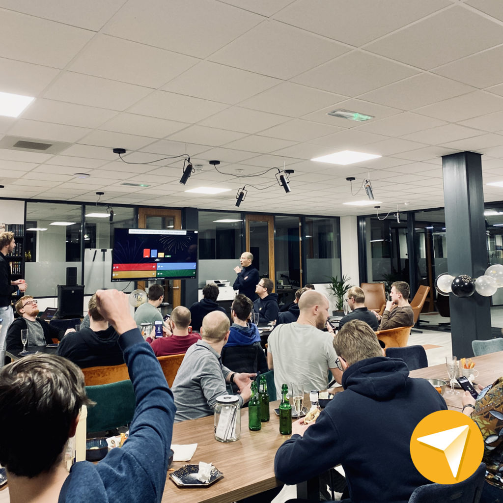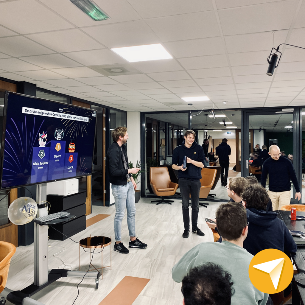 De kantine hing vol met goudkleurige confetti ballonnen, happy new year slingers en de glazen met champagne stonden al klaar. De meeste collega's druppelen rond 17:00 uur de kantine binnen. De geur van vers gebakken hamburgers kwam je op de trap al tegemoet. Nadat de buikjes gevuld waren kon de grote, enige, echte Covadis 2022 einde van het jaar quiz beginnen. Een quiz vol met vragen over onze eigen Covadianen. Onze developer Geert ging er met de winst vandoor!
