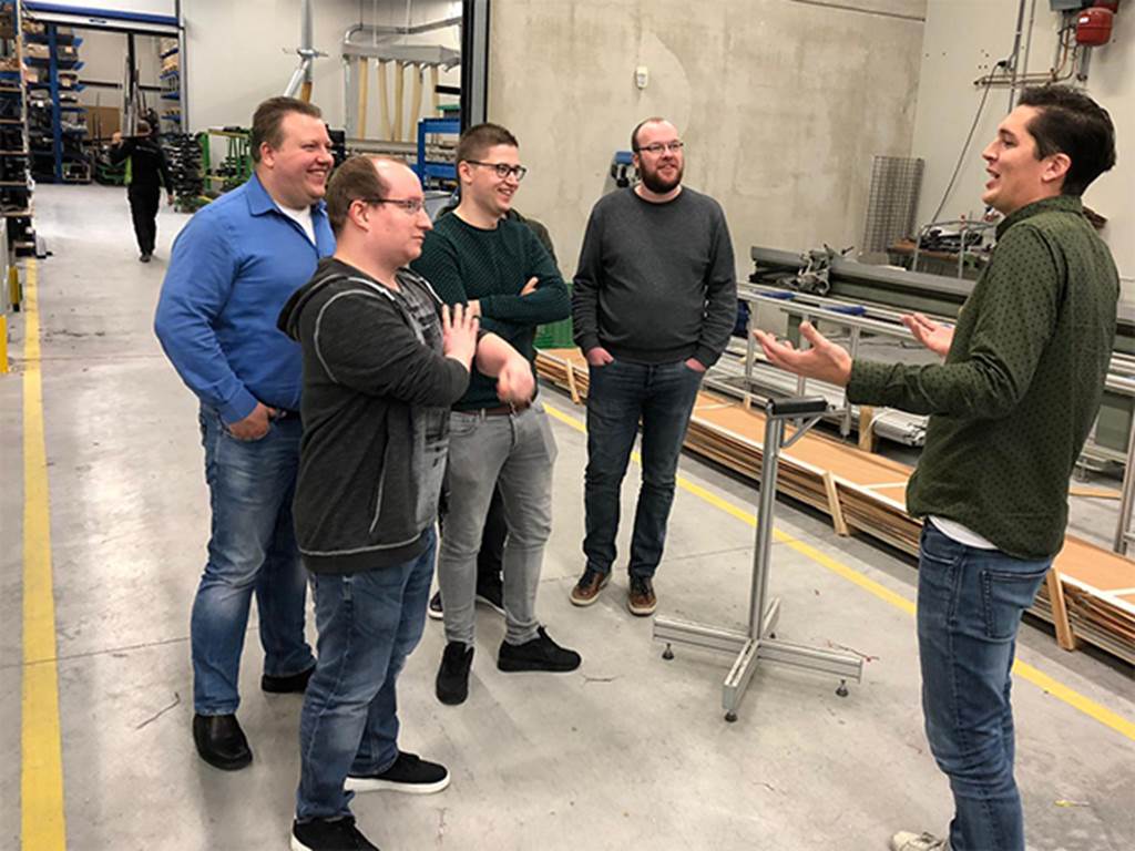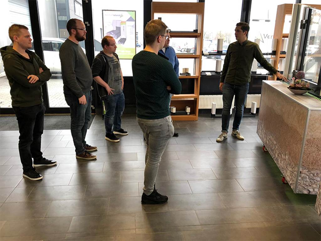 Het ontwikkelteam, bestaande uit meerdere ontwikkelaars, een projectleider en een software-architect, trok vanuit Doetinchem naar het nabijgelegen Zelhem. Daar werden ze door een productontwikkelaar van Venster Techniek hartelijk ontvangen in de showroom. Hier vergaapt het ontwikkelteam zich aan diverse dorpels voor kozijnen van hout en kunststof. Waar een enkeling misschien een ander neutje verwachtte, werd het team voorzien van koffie. Hierop volgde de rondleiding.